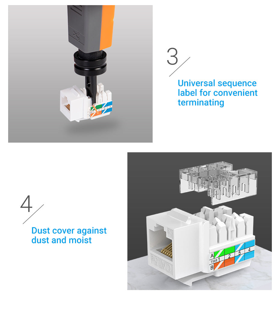 - Ease of Installation: The keystone jack features a universal sequence label for convenient wiring and terminating. This design simplifies the installation process, reducing time and effort, and minimizing the risk of wiring errors.